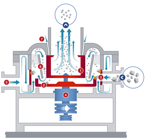 El aire suministrado desde abajo transporta el material triturado a la rueda clasificadora tras una desviación en la tapa del molino. Así se separan las partículas según su tamaño. Solo las partículas que ya han alcanzado la finura deseada pueden pasar por la rueda clasificadora y salir de la máquina como producto acabado. Las partículas más gruesas, en cambio, son rechazadas por la rueda clasificadora y vuelven a entrar en la zona de molienda. De este modo se crea un ciclo de molienda y clasificación hasta que el material alimentado se reduce a la finura deseada.