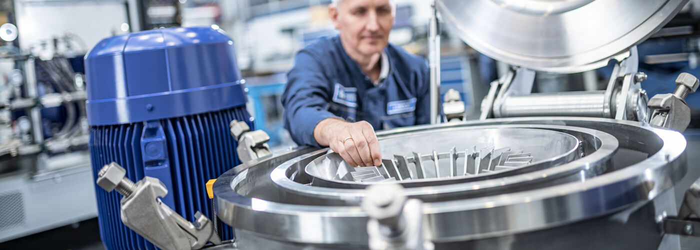La finura del producto final puede controlarse de dos maneras: por un lado, mediante el ajuste de las herramientas de molienda y, por otro, mediante la velocidad de rotación de la rueda clasificadora. Una velocidad más alta significa que solo las partículas más finas pueden pasar a través del clasificador, mientras que a una velocidad más baja, las partículas más gruesas también llegan al espacio del producto acabado.
